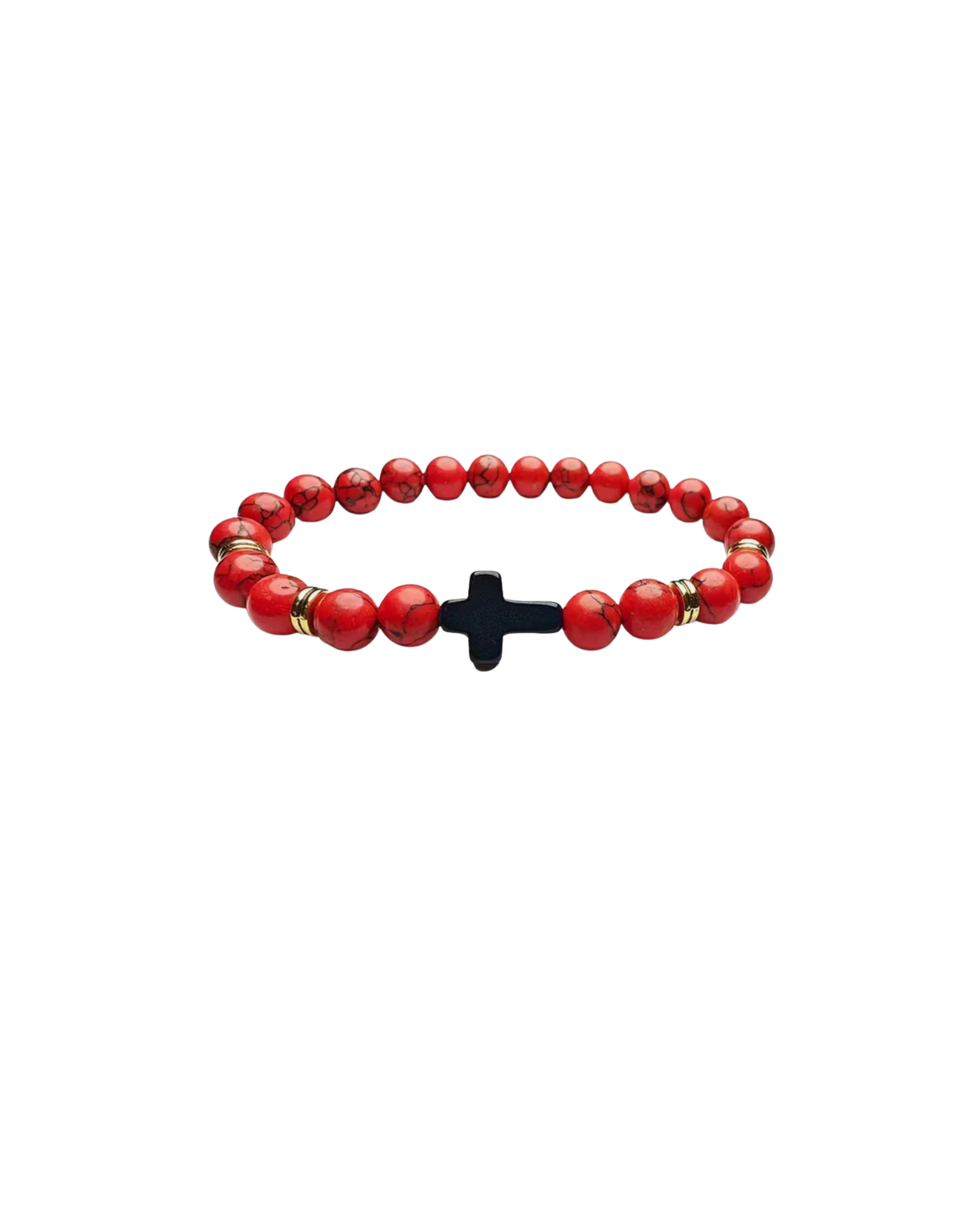 Elevate your style with this elegant Red beaded bracelet, featuring a bold black cross charm and accented with golden spacers. A perfect accessory for both casual and spiritual wear, offering comfort and meaning at an affordable price.